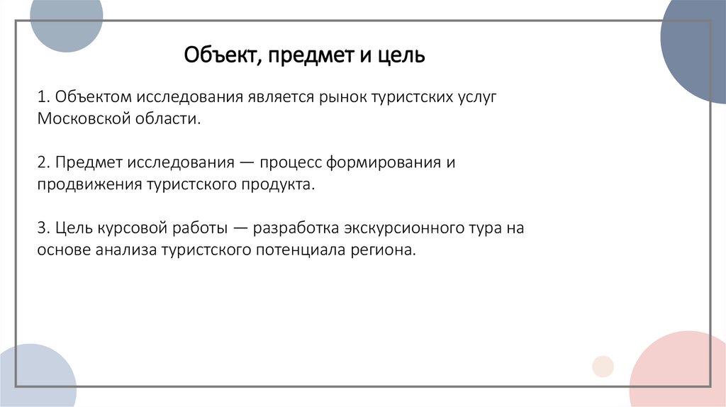 Объект, предмет и цель1. Объектом исследования является рынок туристских услуг
