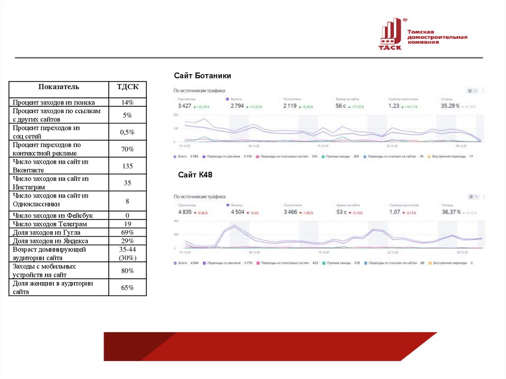 ОАО ТДСК за декабрь 20252. Сайт ТДСК несколько вырос Общие выводы и краткие итоги: Посещаемость выросла у ТДСК и Этажей с Ломоносовым, у прочих