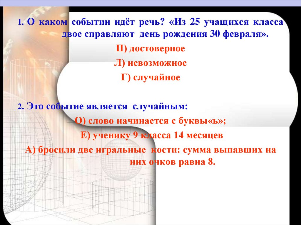 1. О каком событии идёт речь? «Из 25 учащихся классадвое справляют день рождения 30 февраля».