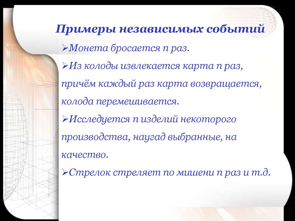 Примеры независимых событийМонета бросается n раз.