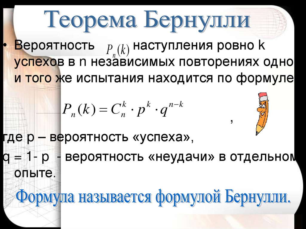 q = 1- p - вероятность «неудачи» в отдельном
