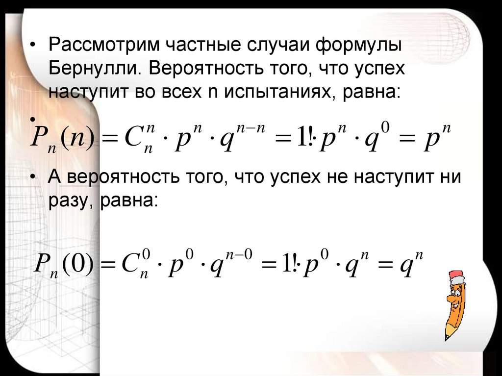 • Рассмотрим частные случаи формулыБернулли. Вероятность того, что успех