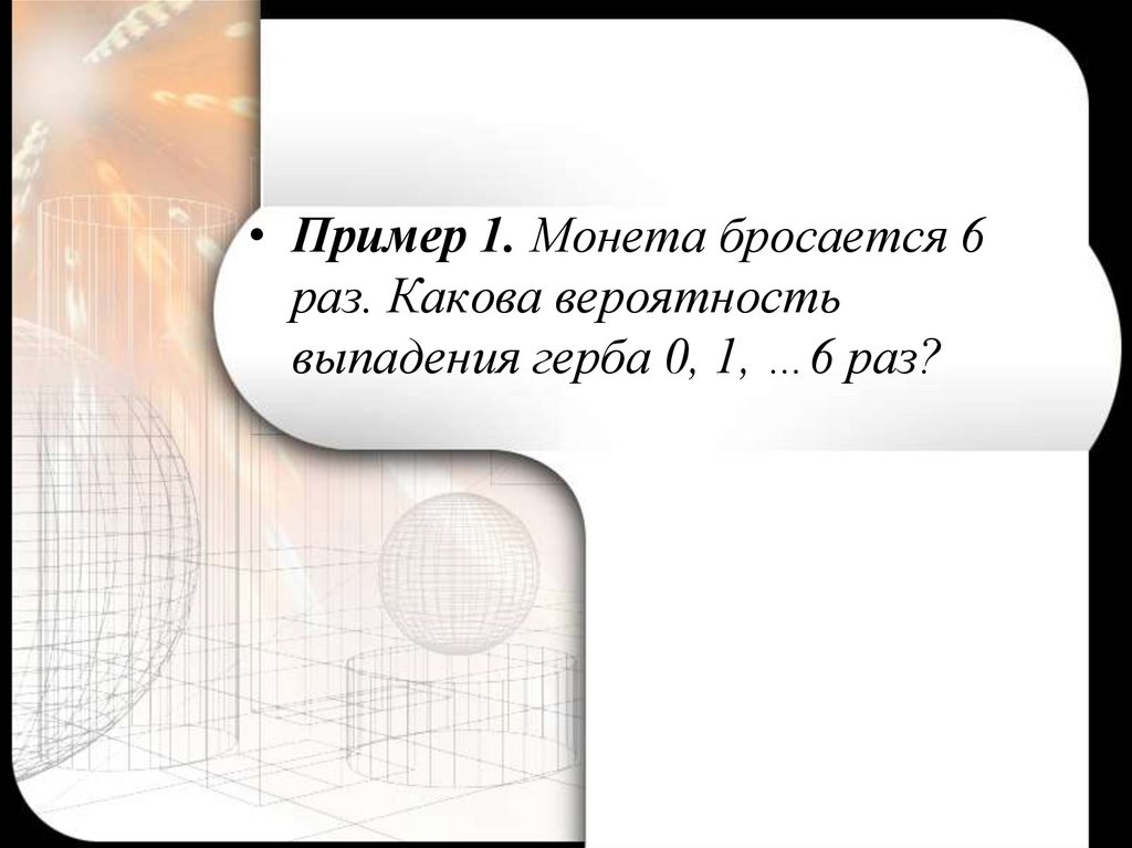 • Пример 1. Монета бросается 6раз. Какова вероятность