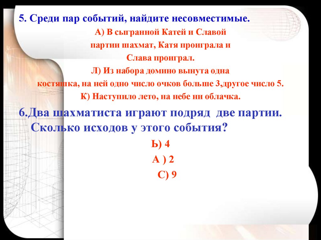 5. Среди пар событий, найдите несовместимые.А) В сыгранной Катей и Славой