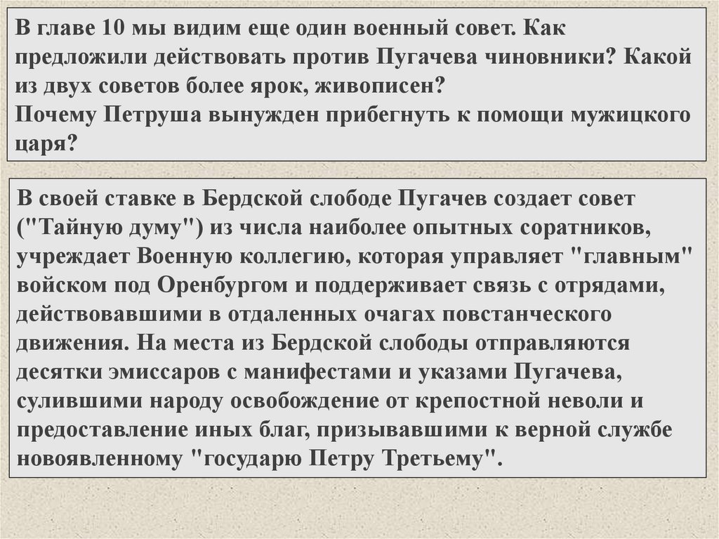 В главе 10 мы видим еще один военный совет. Какпредложили действовать против Пугачева чиновники? Какой