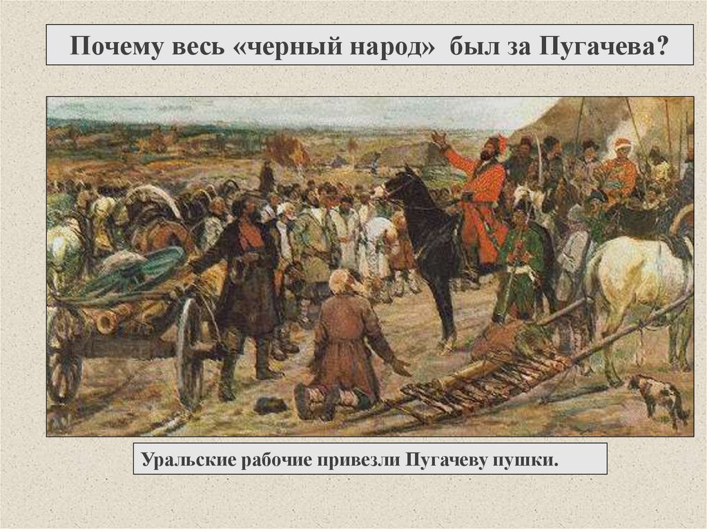 Почему весь «черный народ» был за Пугачева?Уральские рабочие привезли Пугачеву пушки.