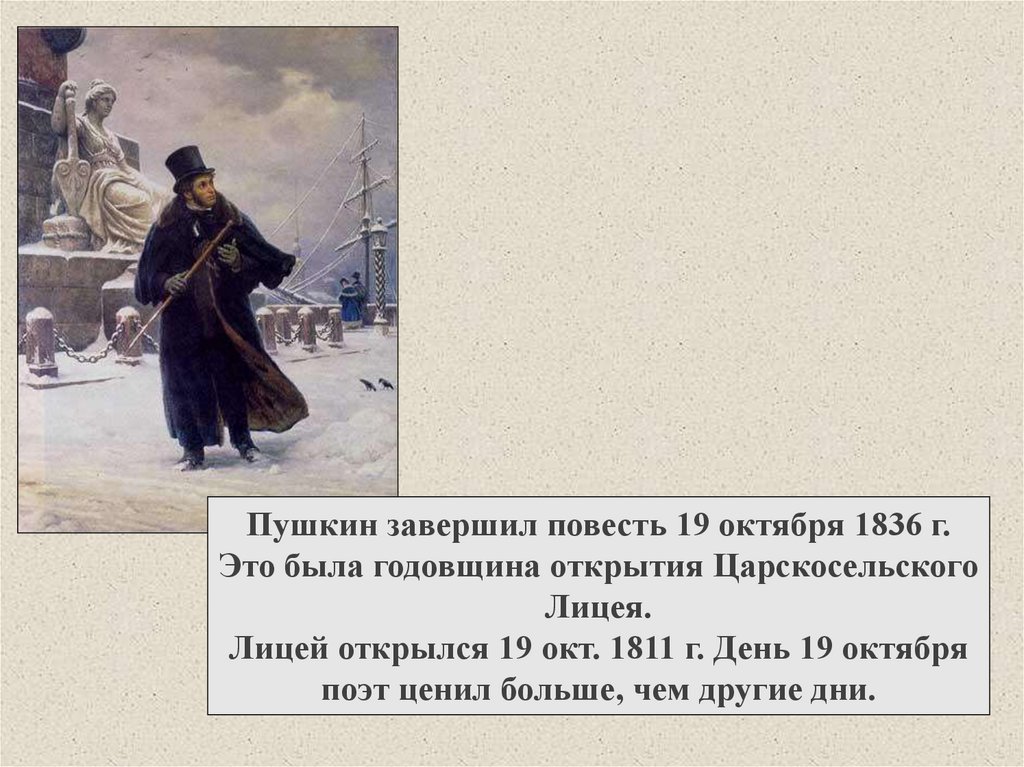 Пушкин завершил повесть 19 октября 1836 г.Это была годовщина открытия Царскосельского