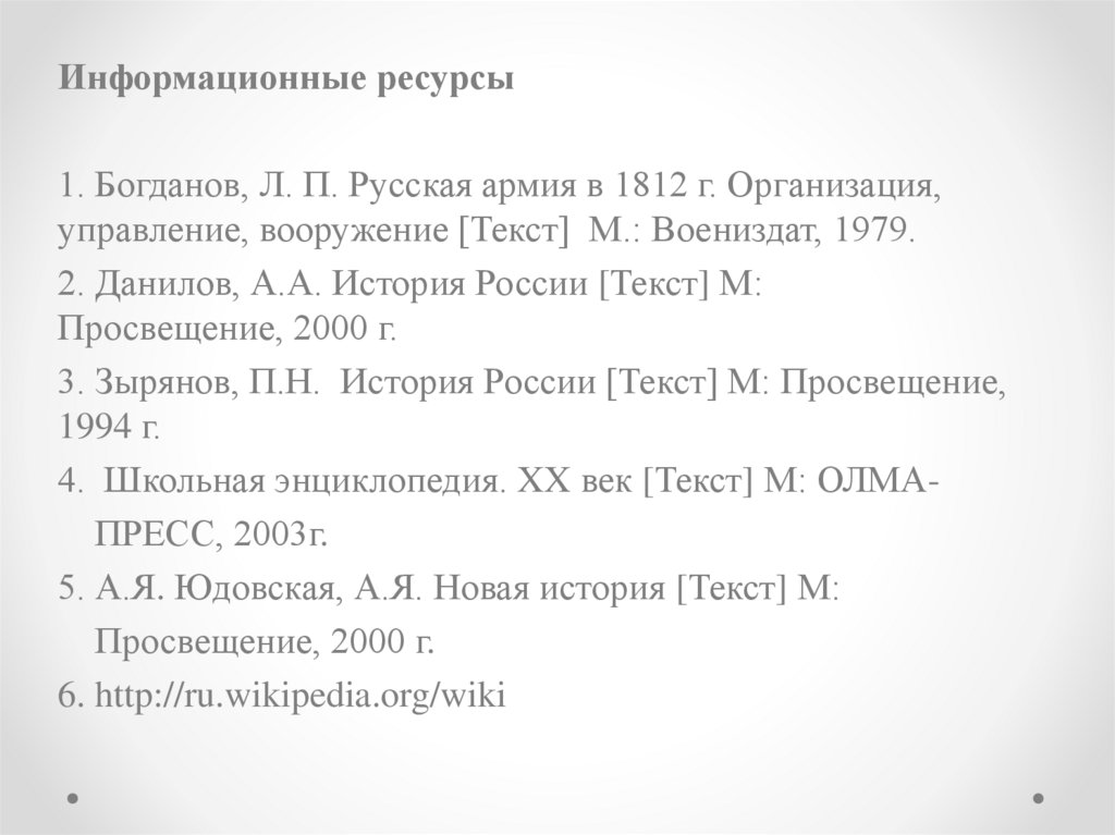 Информационные ресурсы1. Богданов, Л. П. Русская армия в 1812 г. Организация,
