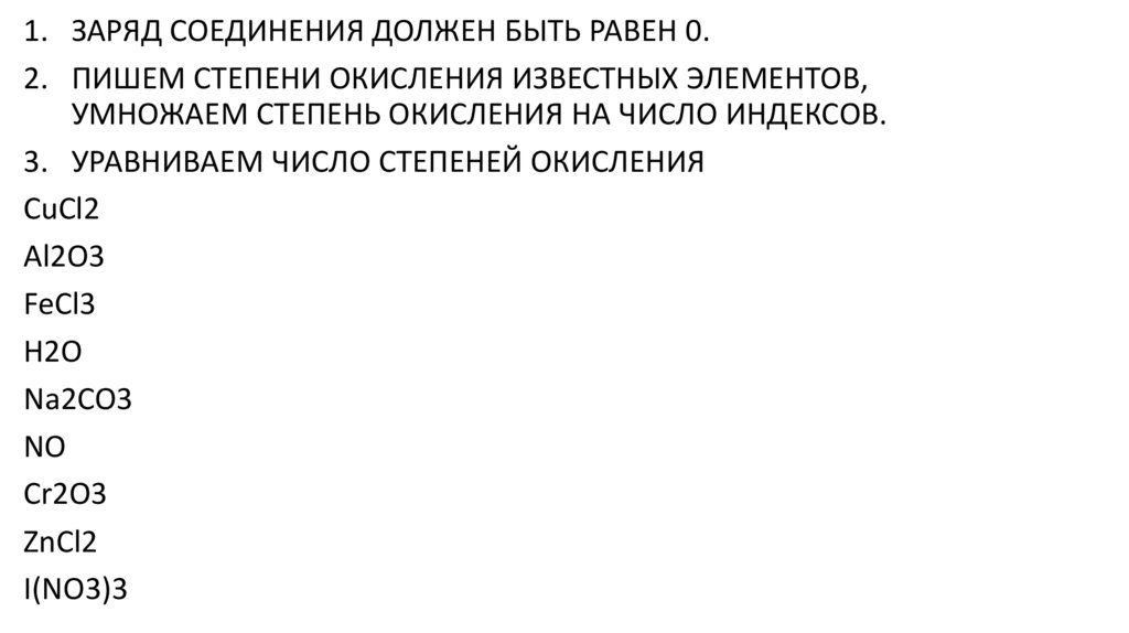 1. ЗАРЯД СОЕДИНЕНИЯ ДОЛЖЕН БЫТЬ РАВЕН 0.2. ПИШЕМ СТЕПЕНИ ОКИСЛЕНИЯ ИЗВЕСТНЫХ ЭЛЕМЕНТОВ,