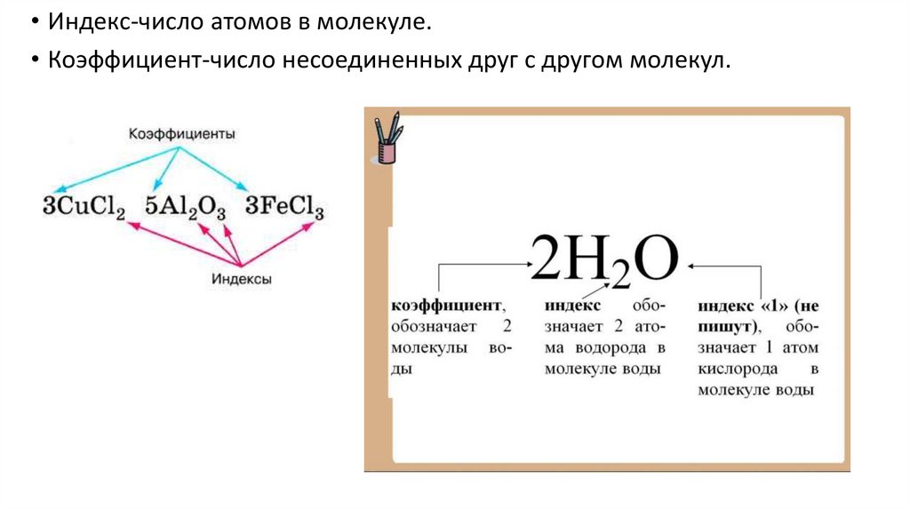 • Индекс-число атомов в молекуле.• Коэффициент-число несоединенных друг с другом молекул.