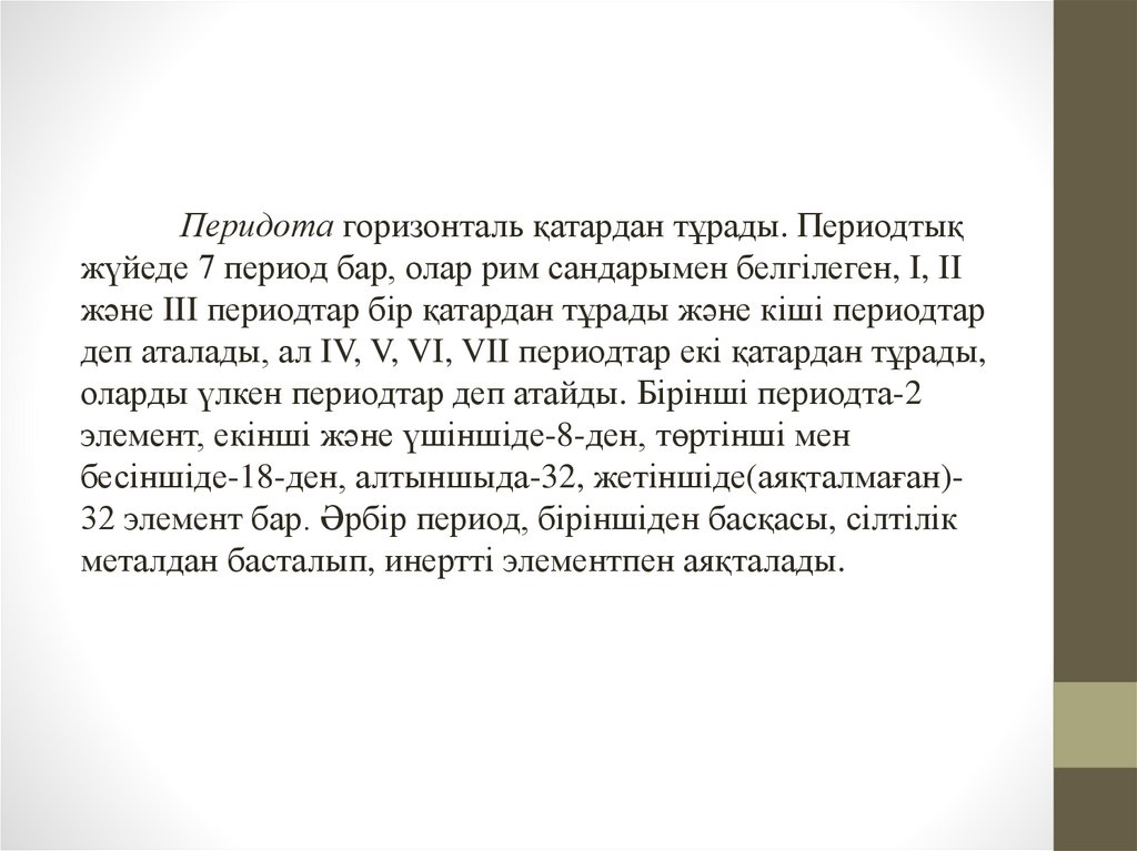 Перидота горизонталь қатардан тұрады. Периодтықжүйеде 7 период бар, олар рим сандарымен белгілеген, I, II