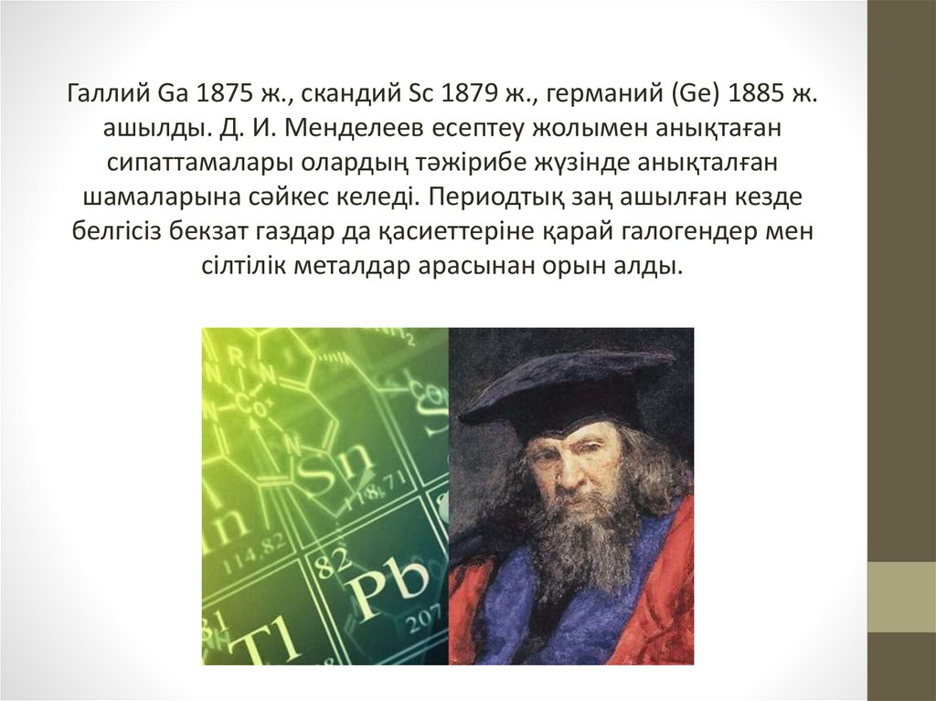 Галлий Ga 1875 ж., скандий Sc 1879 ж., германий (Ge) 1885 ж.ашылды. Д. И. Менделеев есептеу жолымен анықтаған