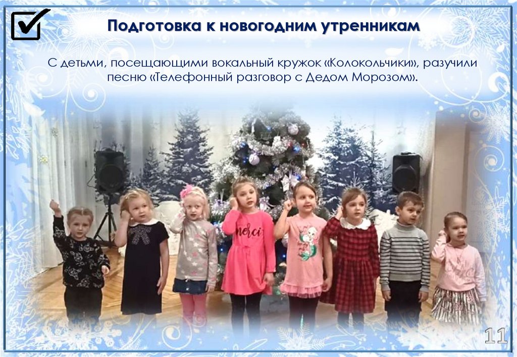 Подготовка к новогодним утренникамС детьми, посещающими вокальный кружок «Колокольчики», разучили