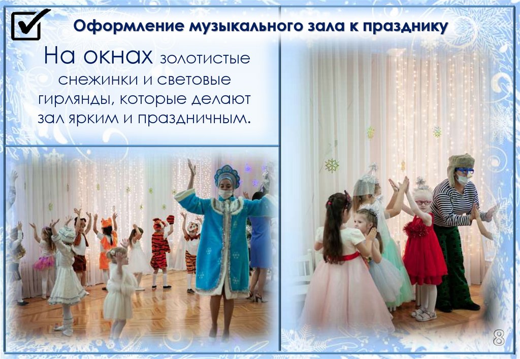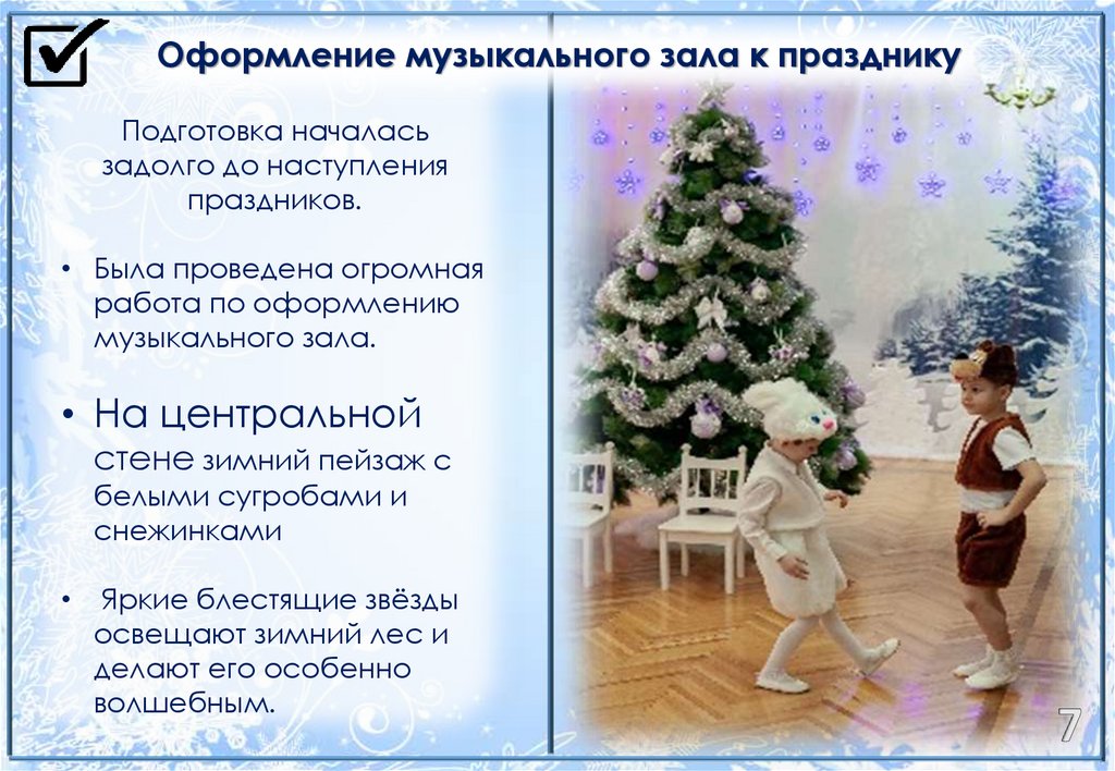 Оформление музыкального зала к празднику• В центре музыкального зала –