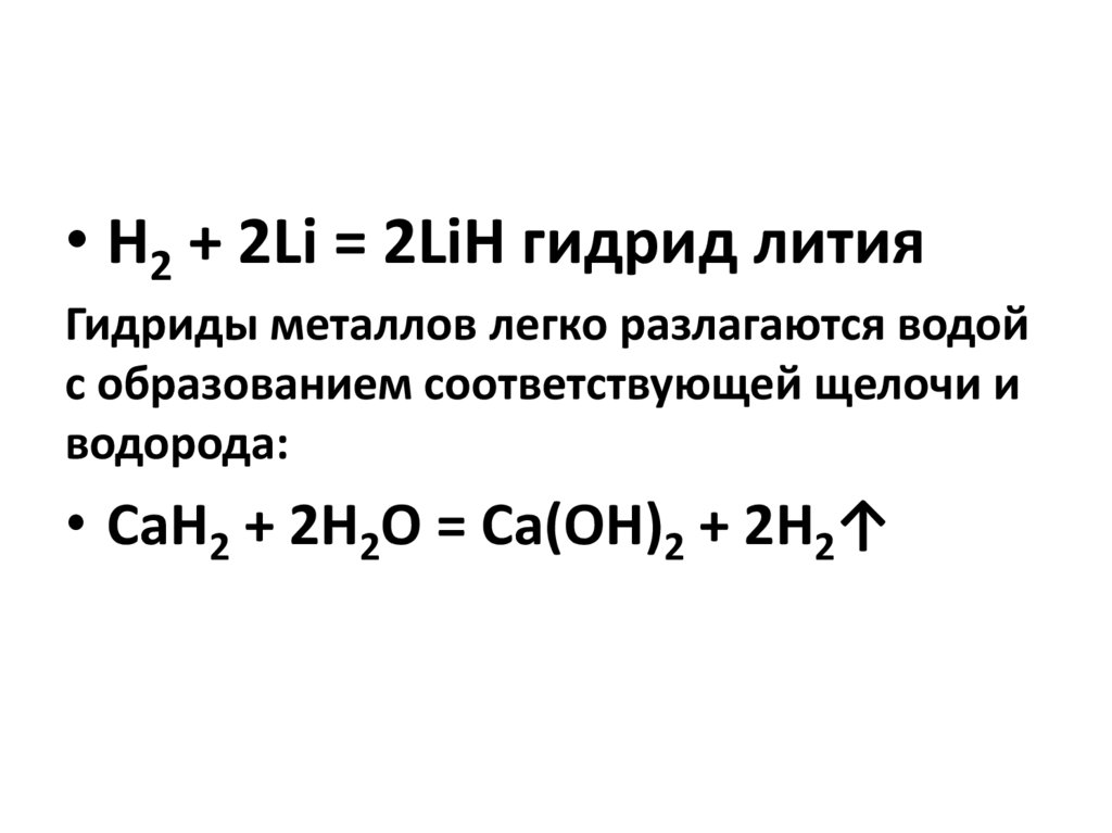 • Н2 + 2Li = 2LiH гидрид литияГидриды металлов легко разлагаются водой