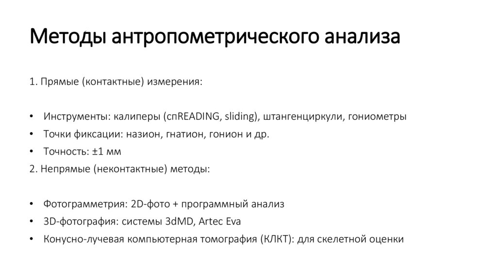 Методы антропометрического анализа1. Прямые (контактные) измерения: