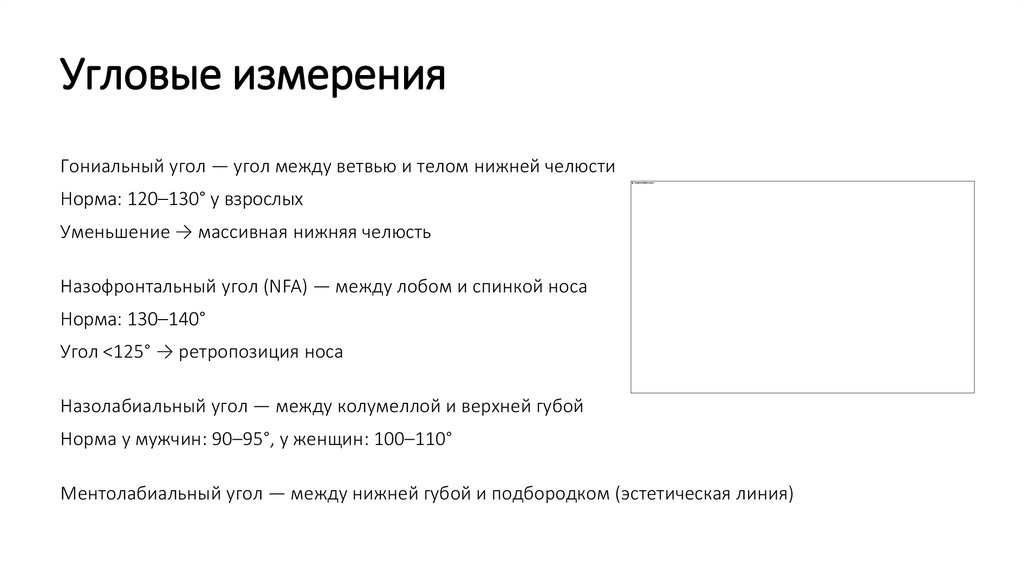 Угловые измеренияГониальный угол — угол между ветвью и телом нижней челюсти
