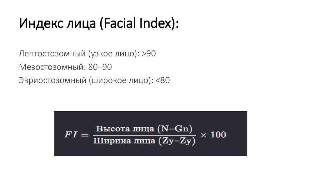 Индекс лица (Facial Index):Лептостозомный (узкое лицо): >90
