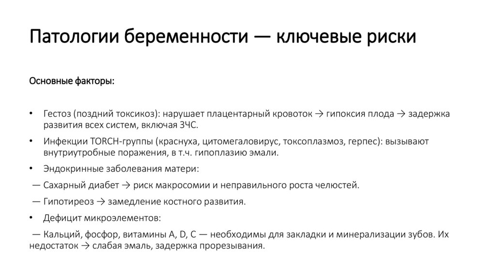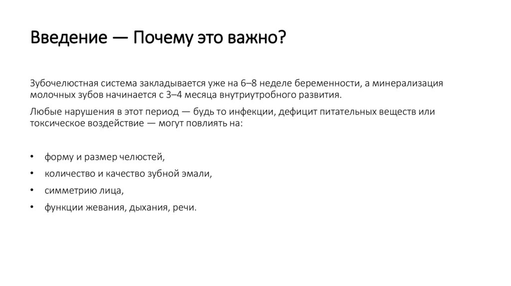 Введение — Почему это важно?Зубочелюстная система закладывается уже на 6–8 неделе беременности, а минерализация