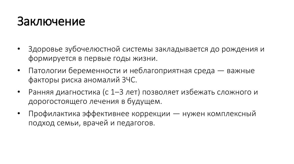 Заключение• Здоровье зубочелюстной системы закладывается до рождения и