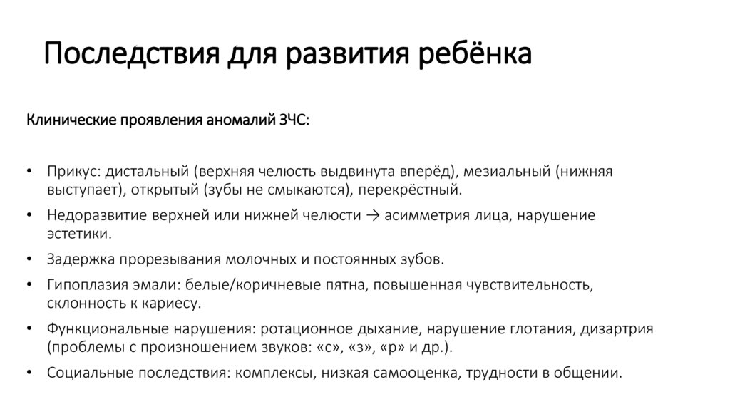 Последствия для развития ребёнкаКлинические проявления аномалий ЗЧС:
