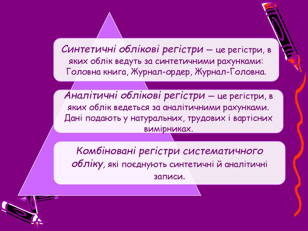 Синтетичні облікові регістри — це регістри, вяких облік ведуть за синтетичними рахунками: