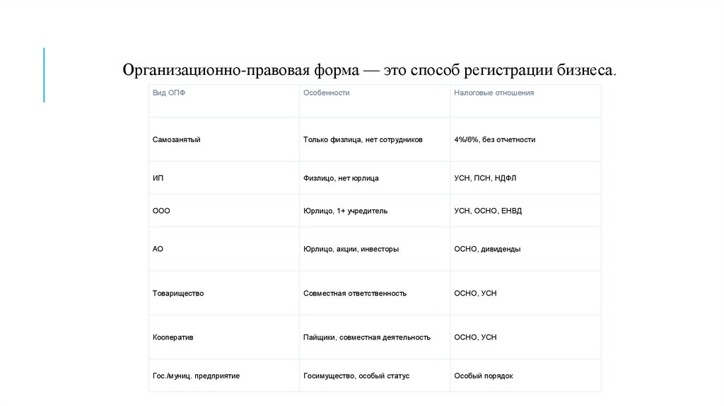 Организационно-правовая форма — это способ регистрации бизнеса.Вид ОПФ