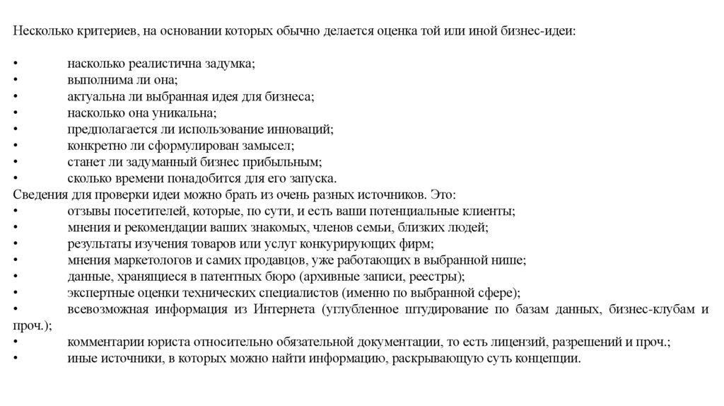 Несколько критериев, на основании которых обычно делается оценка той или иной бизнес-идеи:насколько реалистична задумка;