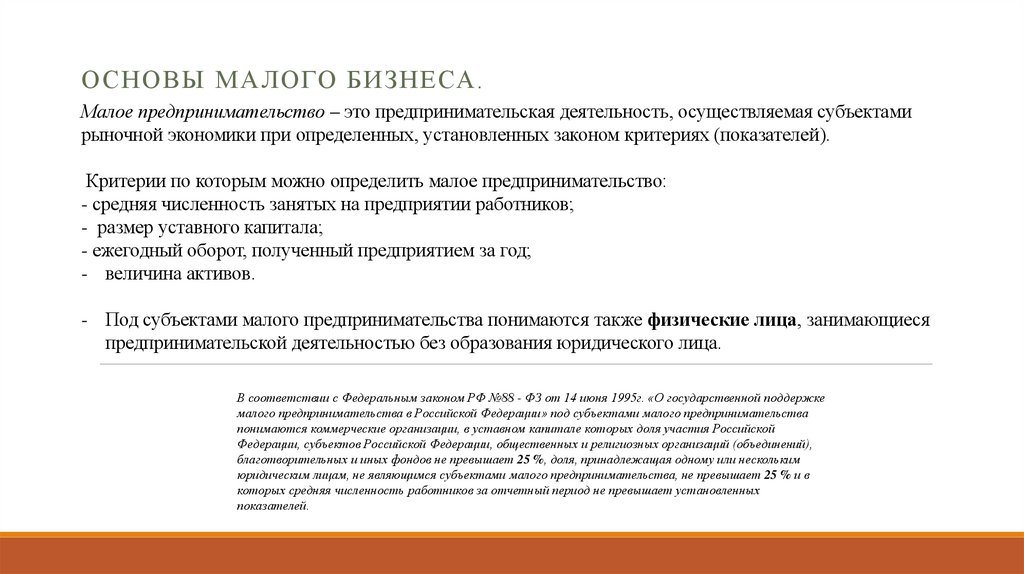 ОСНОВЫ МАЛОГО БИЗНЕСА.Малое предпринимательство – это предпринимательская деятельность, осуществляемая субъектами