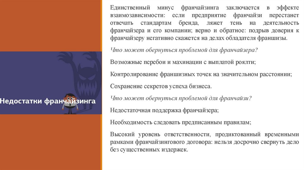 Единственный минус франчайзинга заключается в эффектевзаимозависимости: если предприятие франчайзи перестанет