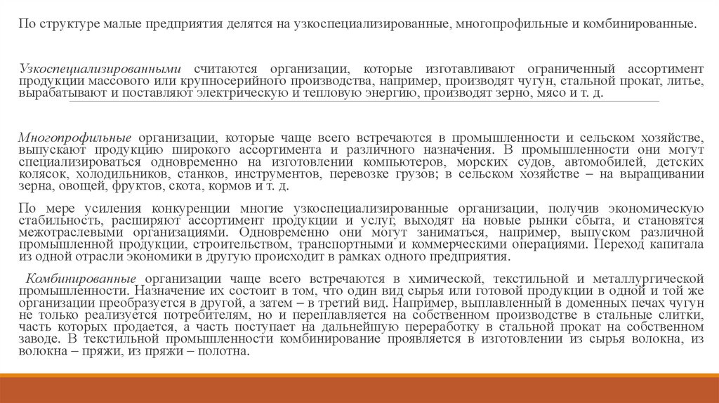 По структуре малые предприятия делятся на узкоспециализированные, многопрофильные и комбинированные.Узкоспециализированными считаются организации, которые изготавливают ограниченный ассортимент