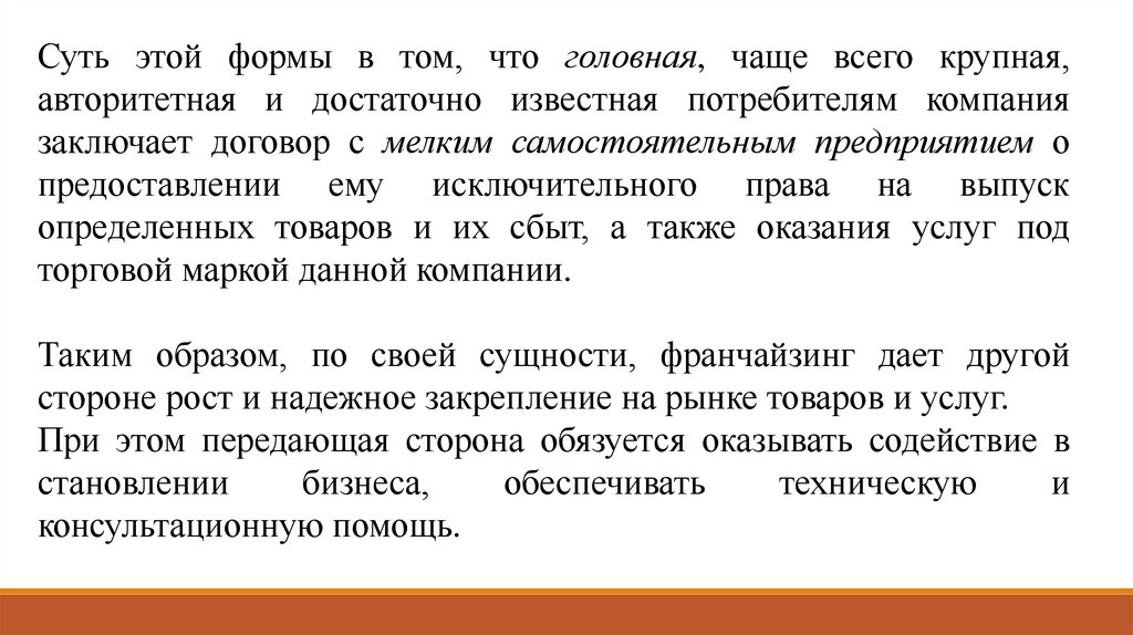 Таким образом, по своей сущности, франчайзинг дает другой