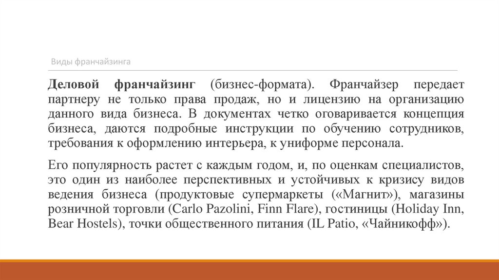 Виды франчайзингаДеловой франчайзинг (бизнес-формата). Франчайзер передает