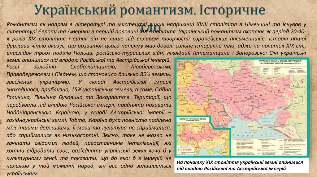 ХІХ століття. Український романтизм охоплює ж період 20-40х років ХІХ століття і виник він не лише під впливом творчості європейських письменників. Історія нашої