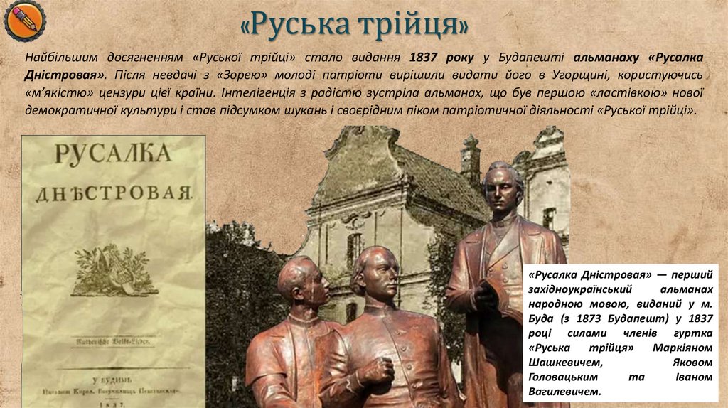 «Руська трійця»Найбільшим досягненням «Руської трійці» стало видання 1837 року у Будапешті альманаху «Русалка