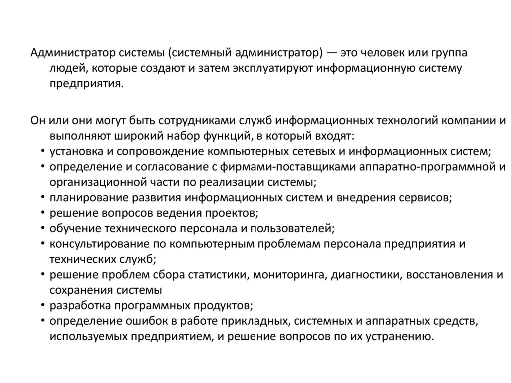 Администратор системы (системный администратор) — это человек или группалюдей, которые создают и затем эксплуатируют информационную систему