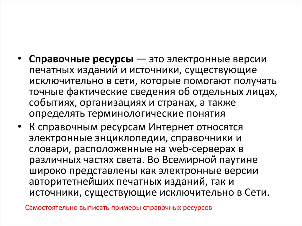 • Справочные ресурсы — это электронные версиипечатных изданий и источники, существующие