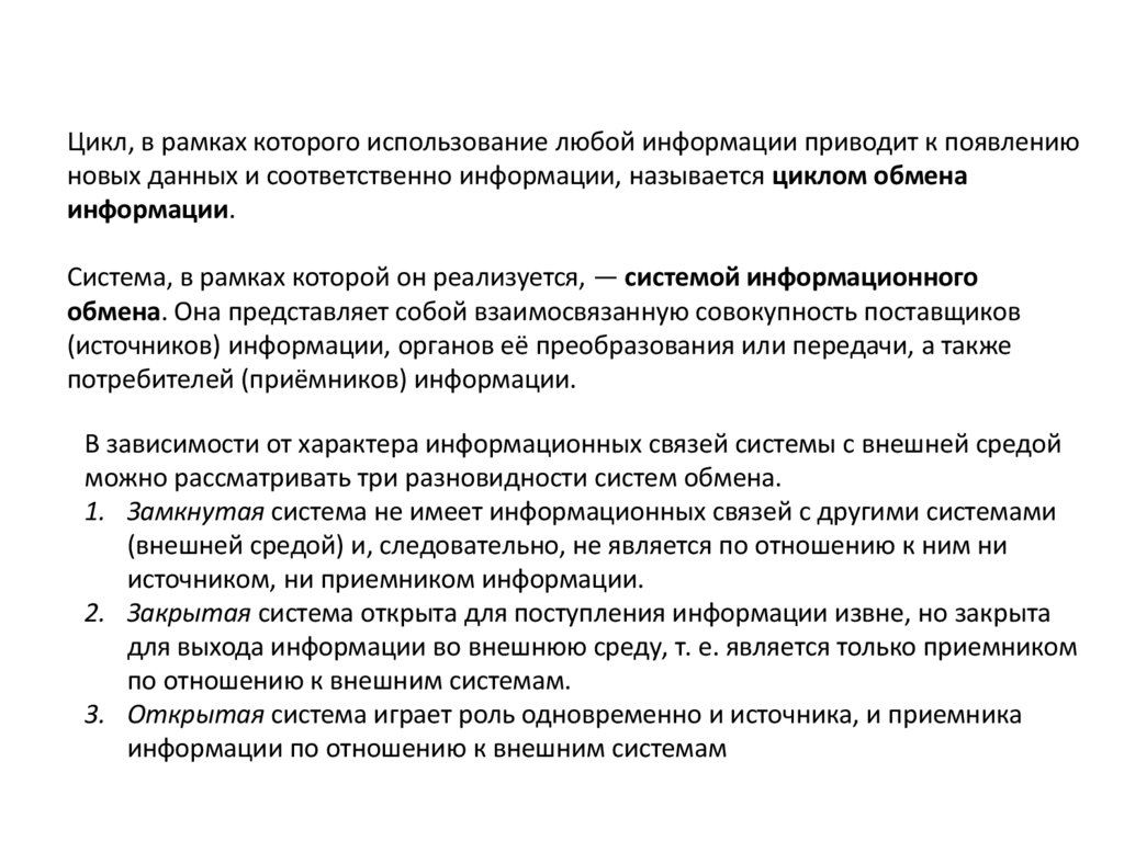 Цикл, в рамках которого использование любой информации приводит к появлениюновых данных и соответственно информации, называется циклом обмена