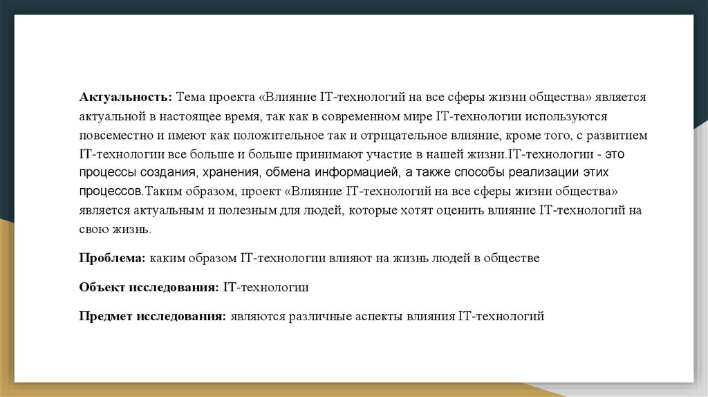 Актуальность: Тема проекта «Влияние IT-технологий на все сферы жизни общества» являетсяактуальной в настоящее время, так как в современном мире IT-технологии используются