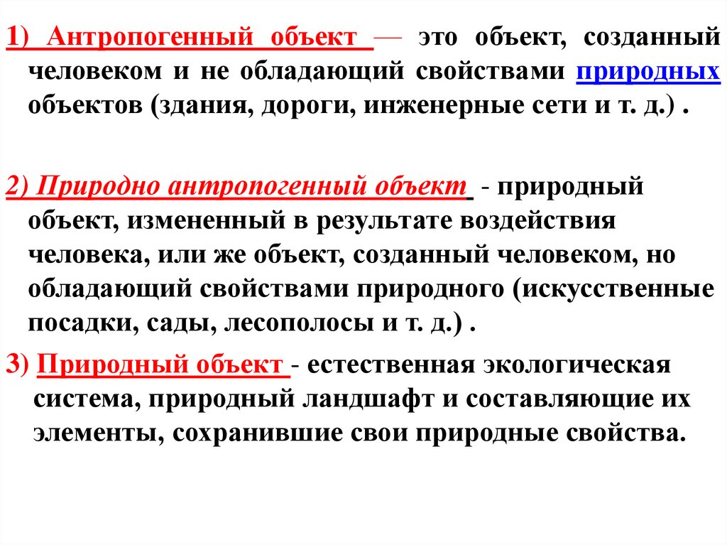 1) Антропогенный объект — это объект, созданныйчеловеком и не обладающий свойствами природных