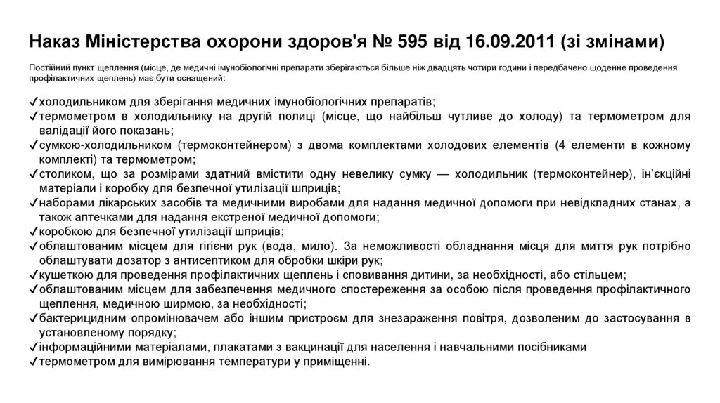 Наказ Міністерства охорони здоров'я № 595 від 16.09.2011 (зі змінами)Постійний пункт щеплення (місце, де медичні імунобіологічні препарати зберігаються більше ніж двадцять чотири години і передбачено щоденне проведення