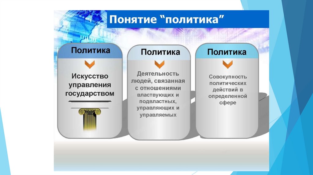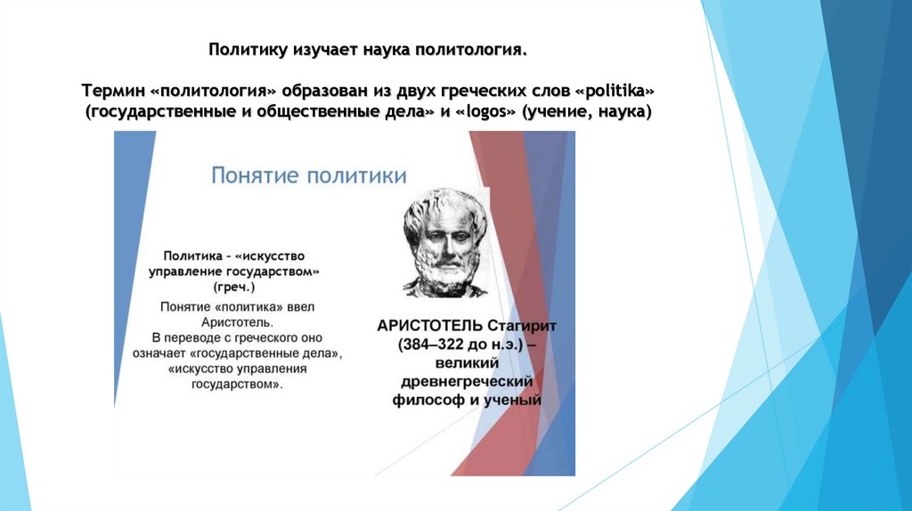 Политику изучает наука политология.Термин «политология» образован из двух греческих слов «politika»