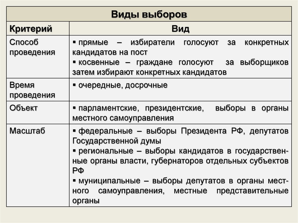 региональные – выборы кандидатов в государственные органы власти, губернаторов отдельных субъектов