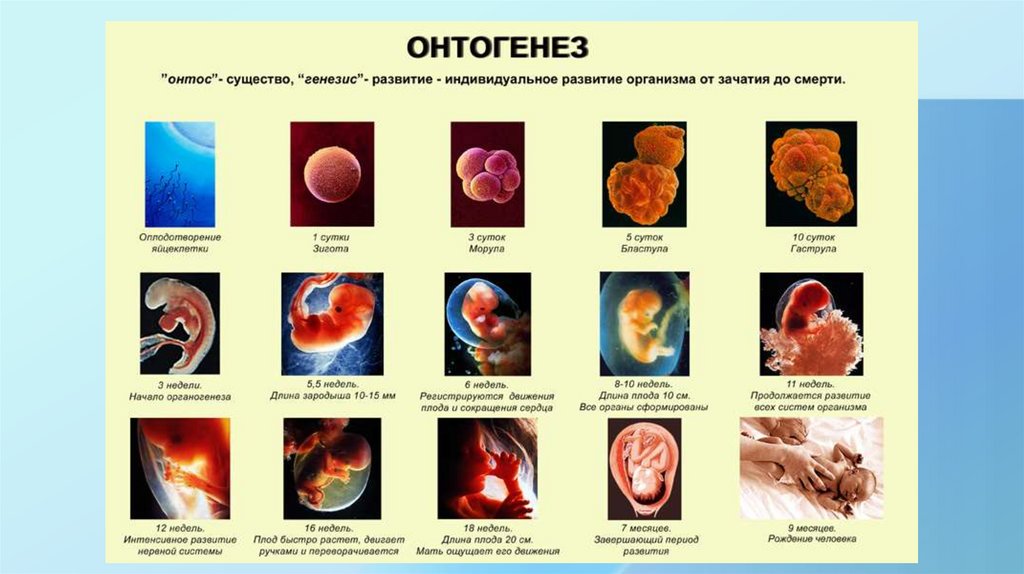 • Развитие организма осуществляется во все периоды его жизни – смомента зачатия до ухода из жизни. Это развитие называется