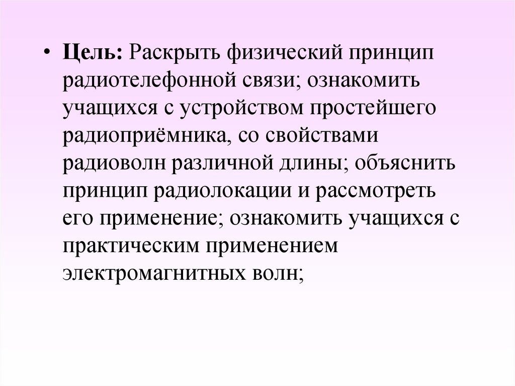 • Цель: Раскрыть физический принципрадиотелефонной связи; ознакомить