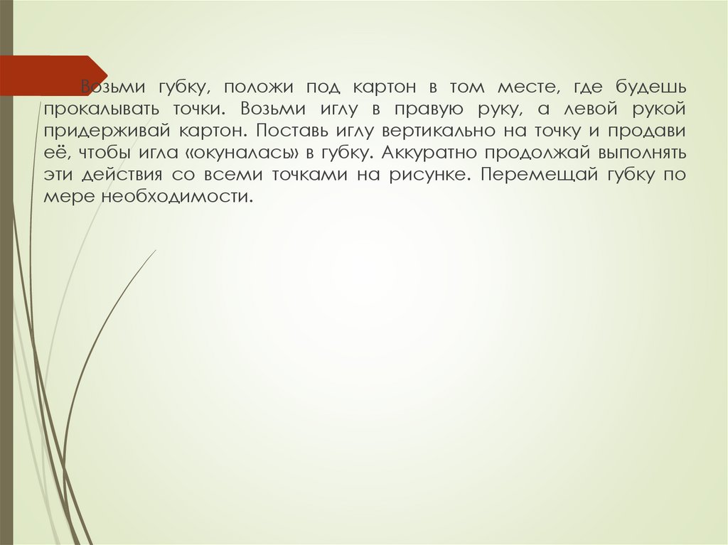 Возьми губку, положи под картон в том месте, где будешьпрокалывать точки. Возьми иглу в правую руку, а левой рукой