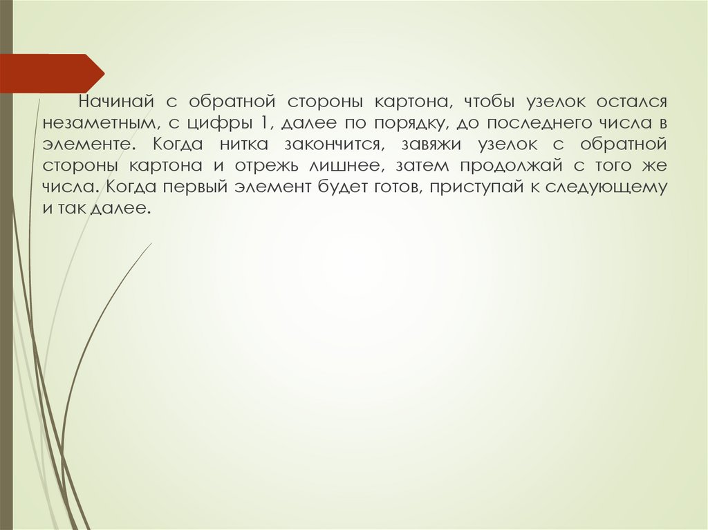Начинай с обратной стороны картона, чтобы узелок осталсянезаметным, с цифры 1, далее по порядку, до последнего числа в