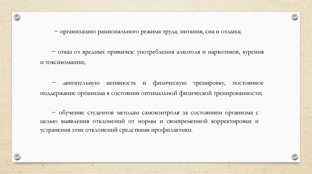 − организацию рационального режима труда, питания, сна и отдыха;− отказ от вредных привычек: употребления алкоголя и наркотиков, курения