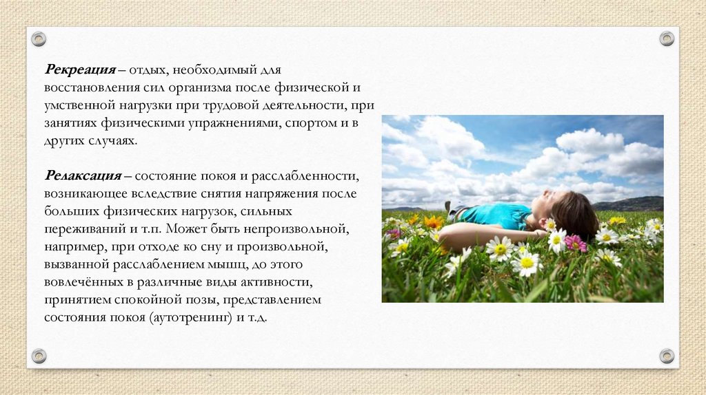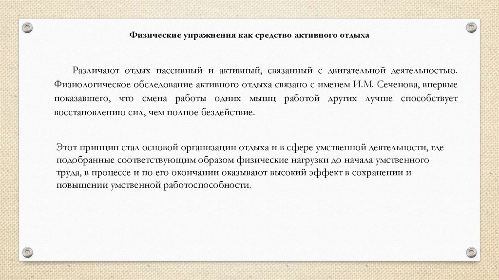 Физические упражнения как средство активного отдыхаРазличают отдых пассивный и активный, связанный с двигательной деятельностью.