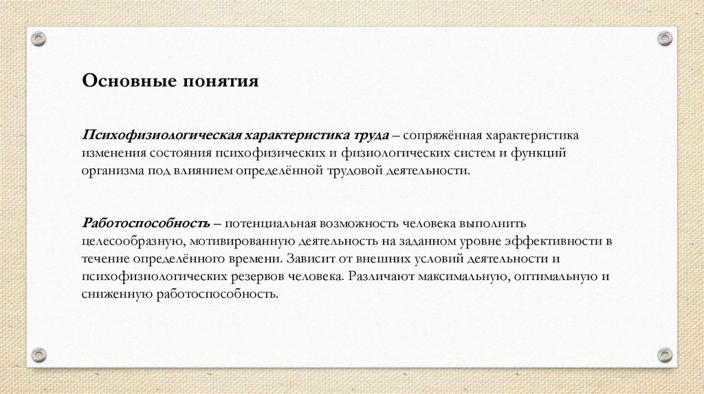 Основные понятияПсихофизиологическая характеристика труда – сопряжённая характеристика